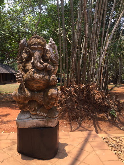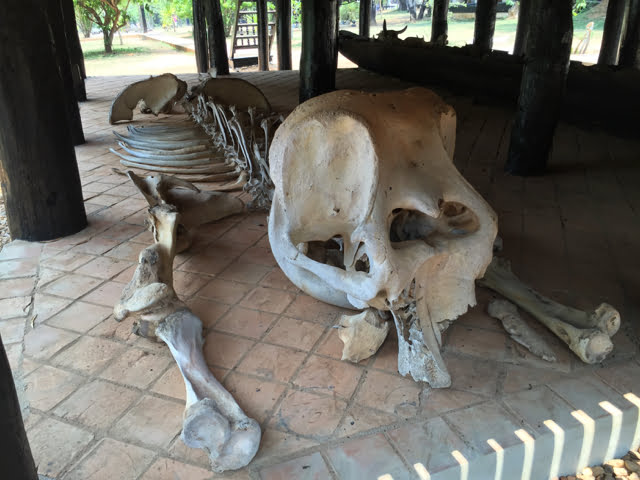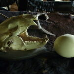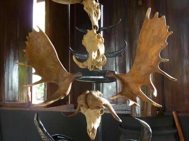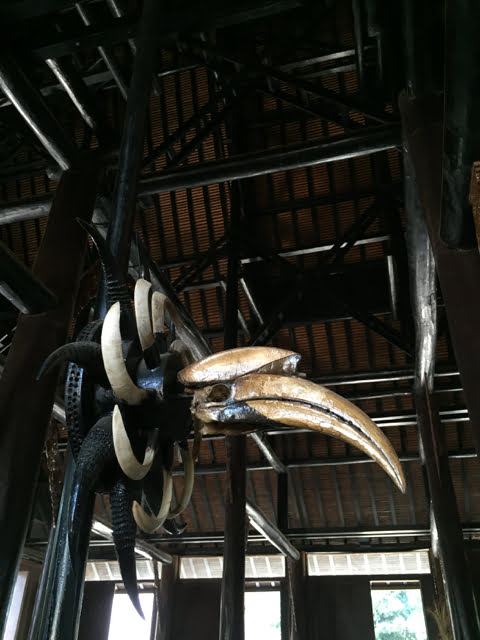 The house is filled with artifacts made of horns, skulls, skins and bones: giant thrones adorned with various bony parts of half a flock sheep and a few buffaloes, garnered around long tables with giant snakeskin runners. Horned skulls of all shapes and sizes lining rooms, or built up as totem poles, or spread out decoratively inside a round pagoda-like structure, guarded by skinny statues with immense penises, an entire elephant skeleton resting under the elevated floor of another lugubrious dwelling. The fainthearted have no business here.